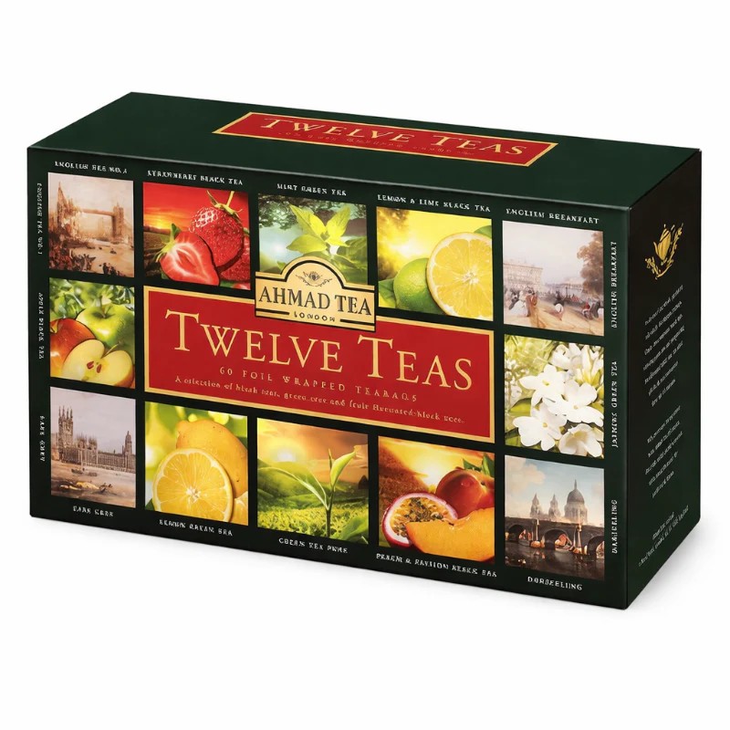 Ahmad Tea Twelve Teas 120 g to starannie skomponowany zestaw 12 różnych herbat ekspresowych od brytyjskiej marki Ahmad Tea. W eleganckim opakowaniu znajdziesz kompozycje czarne, zielone i owocowe – od klasycznie intensywnych po lekkie i orzeźwiające.