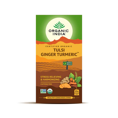 Organic India Tulsi Turmeric Ginger Tea (25saszetek) to popularna herbata ziołowa, która łączy zdrowotne właściwości Tulsi, kurkumy i imbiru. Tulsi, znana również jako święta bazylia, jest rośliną tradycyjnie stosowaną w medycynie ajurwedyjskiej, cenioną za swoje właściwości lecznicze, w tym zdolność redukcji stresu i wspomagania relaksacji. Kurkuma to przyprawa powszechnie używana w kuchni indyjskiej, znana ze swoich przeciwzapalnych i antyoksydacyjnych właściwości. Imbir to kolejna przyprawa o działaniu przeciwzapalnym i wspomagającym trawienie.