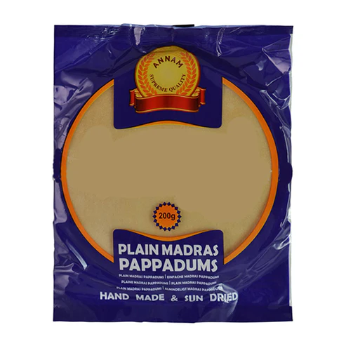 Plain Madras Pappadums to chrupiące, cienkie płaskie pieczywo, które jest nieodłącznym elementem kuchni indyjskiej. Wykonane z mąki z soczewicy, mąki ryżowej i soli.