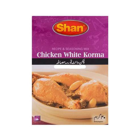 Zamarynuj 500 g kawałków kurczaka w 125 g jogurtu i 2 łyżkach mieszanki Shan Chicken White Korma Masala, podsmaż na klarowanym maśle lub oleju z cebulą i czosnkiem, dodaj 100 ml śmietanki lub mleka, gotuj na małym ogniu do miękkości mięsa, na koniec opcjonalnie dodaj zmielone migdały i podawaj z ryżem lub naanem.