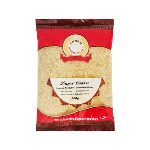 Annam Lapsi Coarse to wysokiej jakości grubo łamana pszenica, znana również jako Dalia. Powstaje z pełnych ziaren twardej pszenicy, które zostały połamane na grube kawałki, zachowując bogactwo błonnika, białka i minerałów, takich jak żelazo i magnez.